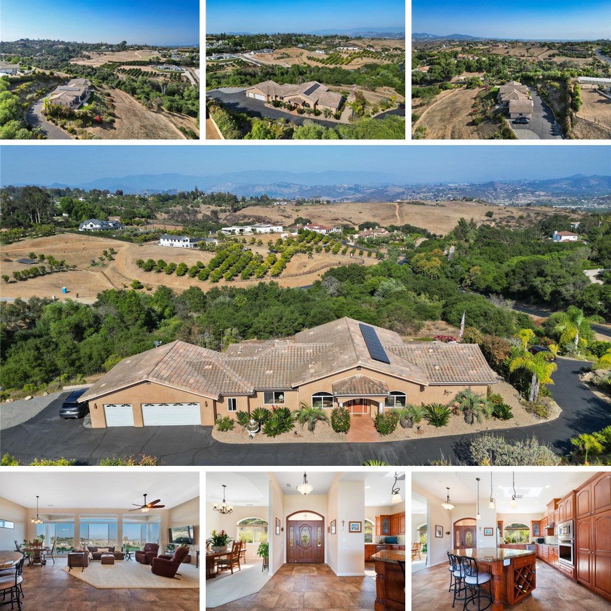 Discover your dream home in the exclusive gated community of Hill Ranch, boasting stunning views of Palomar Mountain and over seven acres with majestic oak trees. This Mediterranean-inspired single-level residence offers an exceptional blend of luxury and tranquility, perfect for those seeking both serenity and sophistication. With a potential lot split or an ideal area for a detached ADU, and owned solar, the possibilities are endless. Step inside to find a bright and airy kitchen featuring granite countertops, stainless steel appliances and a generous center island, seamlessly flowing into a spacious great room. A wall of windows bathes the space in natural light while highlighting the breathtaking views outside. This elegant home includes 3 well-appointed bedrooms and 3 bathrooms, along with a 3-car garage and RV parking—perfect for adventure enthusiasts. Embrace the outdoors on your expansive property and enjoy the ultimate Fallbrook lifestyle. Don’t miss this rare opportunity to own a piece of paradise in Hill Ranch!